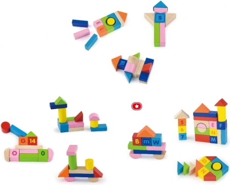 Cuburile colorate din lemn durabil, imprimate cu litere, cifre și semne matematice, susțin învățarea prin joc și rezistă utilizării zilnice.