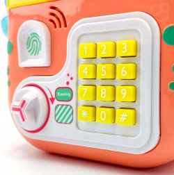 Depuneți monede și bancnote prin fante separate, setați parola și deschideți cu ajutorul butonului rotativ. Ideal pentru primele etape ale educației financiare.