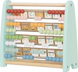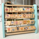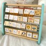 O față conține un abac clasic cu bile pentru calcul, cealaltă față are blocuri rotative cu litere ale alfabetului și imagini pentru învățare interactivă.