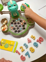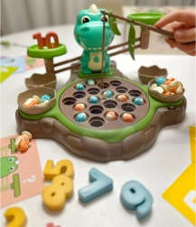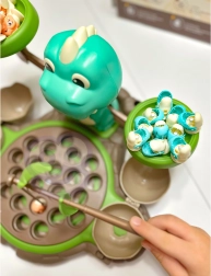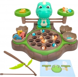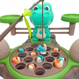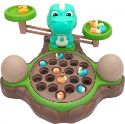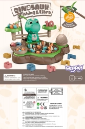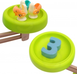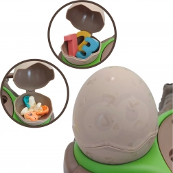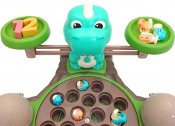 Jucăria Dinozaur cu greutate de la WOOPIE oferă copiilor posibilitatea de a explora lumea numerelor și a operațiilor matematice în timpul unui joc distractiv de prindere a dinozaurilor. La bază este un platou rotativ, de pe care se pot prinde dinozauri mici. Prin apăsarea unui buton, platoul începe să se rotească și melodia însoțește copiii în timpul jocului. În spatele platoului este un dinozaur mare care servește drept greutate și loc pentru tijele de prindere, care pot fi decorate cu frunze din set. Pe lateral, se află două ouă care se pot închide, servind drept adăpost pentru dinozaurii prinși.