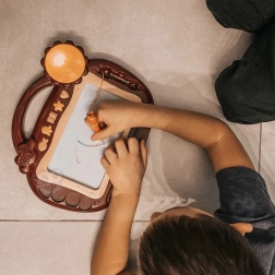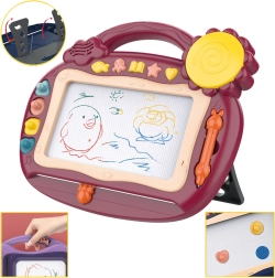 Datorită mânerului practic, tabla se transportă ușor în călătorii și la grădiniță, iar picioarele rabatabile asigură scriere confortabilă la masă. Pachetul include un stilou magnetic și 4 ștampile, care îi motivează pe copii să creeze și le îmbunătățesc motricitatea fină.