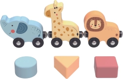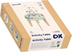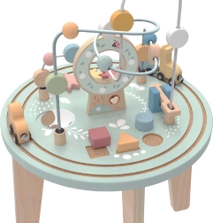 Această măsuță din lemn de înaltă calitate aduce copiilor o lume bogată de forme și culori. Labirintul motric cu două trasee antrenează dexteritatea degetelor, sortatorul de forme îi învață să recunoască formele și culorile, roțile dințate dezvoltă logica și relațiile de cauzalitate, iar trenulețul cu animăluțe drăgălașe parcurge traseul în jurul măsuței.