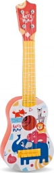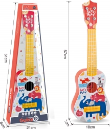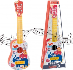 Chitara clasică de la renumita firmă Woopie este un instrument muzical colorat ideal pentru copii, având un design atrăgător cu tematică animalieră. Acest instrument oferă posibilitatea de a învăța primele acorduri, dezvoltând pasiunea muzicală, iar cu puțină răbdare și imaginație, copilul poate susține un adevărat concert acasă. Este un produs excelent pentru a explora primele fascinații muzicale ale copiilor. Degetelele mici vor exersa abilitatea de a alerga pe gâtul chitarei, îmbunătățind semnificativ abilitățile manuale, precum și concentrarea și perseverența. Aceasta imită perfect un instrument real, fiind un adevărat succes în categoria de învățare prin joacă.