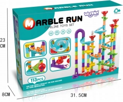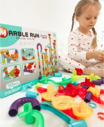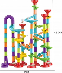 Piesele din plastic de calitate se îmbină ușor și stau bine fixate. Bilele cu diametrul de cca 10 mm rulează fluent prin elementele transparente și colorate. Pista asamblată are dimensiuni compacte, astfel încât încape și în camerele de copii mai mici.
