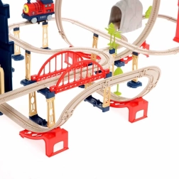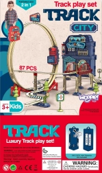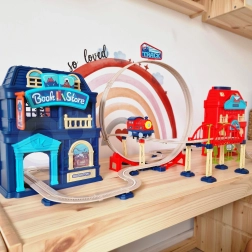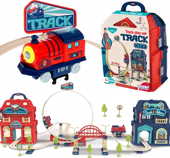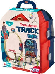 Pista de tren WOOPIE Track City aduce copiilor o lume bogată a imaginației pe o lungime de 3,5 metri de șine. Datorită buclei, viaductului și trecerii la nivel, copiii pot crea cu ușurință trasee dinamice și scene urbane. Valiza 2în1 funcționează ca ambalaj practic și ca parte a lumii de joc – după deschidere formează două clădiri stilizate (de ex. poștă și librărie) care îmbogățesc poveștile și jocurile.