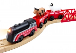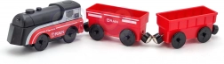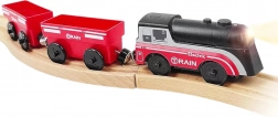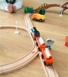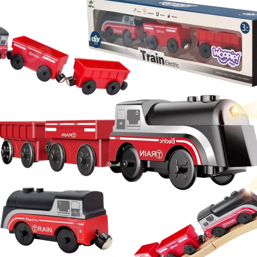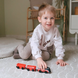 Setul folosește cuplare magnetică a vagoanelor pentru conectare rapidă și intuitivă. Locomotiva este alimentată de o singură baterie AAA (nu este inclusă), aprinde lumina în timpul mersului și se deplasează lin ca un tren adevărat. Datorită ecartamentului standard, este compatibilă cu majoritatea traseelor din lemn (lățimea șinei aprox. 4 cm, lățimea osiței aprox. 2,5 cm) – completează perfect seturile IKEA, Brio și altele.