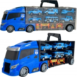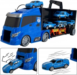 Jucăria ideală pentru micii fani ai vehiculelor de poliție! Acest set conține un camion mare transportor, care poate transporta 4 mașini de poliție, un elicopter și alte semne de avertizare pentru un joc realist. Copiii pot utiliza mecanismul de lansare pentru a trimite mașinuțele la distanțe diferite. Lungimea camionului este de 40 cm, ceea ce este suficient de mare pentru a depozita toate vehiculele și accesoriile. Distracția este astfel nu doar plină de acțiune, ci și educațională.