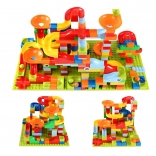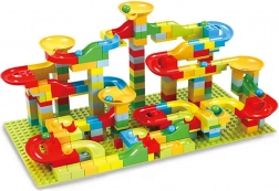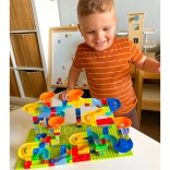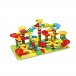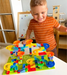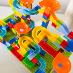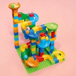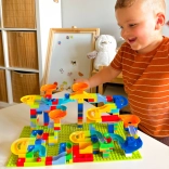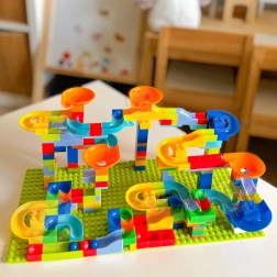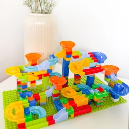 Pachet complet cu numeroase șine, curbe, pâlnii și bile. Construiți trasee simple sau complexe exact după preferințele voastre.