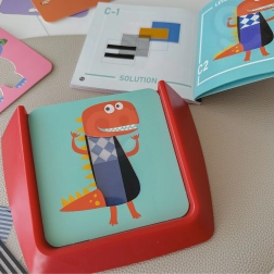 Suportul facilitează aranjarea, iar cardurile clare cu modele îi ghidează pe copii pas cu pas către soluție.