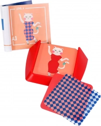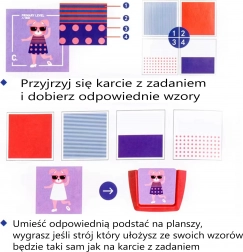 Setul include un suport stabil, patru șabloane de personaje și o selecție variată de carduri cu modele, precum și o cărticică cu sarcini și soluții. Jocul dezvoltă frumos percepția spațială, motricitatea fină și percepția vizuală a formelor, culorilor și modelelor. Excelent ca cadou educativ pentru preșcolari.