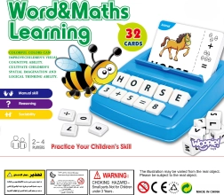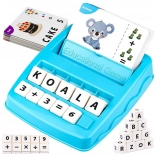Setul include un suport albastru din plastic cu dale pentru litere și numere, care permit formarea cuvintelor și rezolvarea de ecuații.