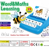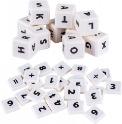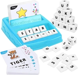Jocul include un tăviță albastră din plastic și blocuri albe pentru învățare prin crearea de cuvinte și ecuații matematice.