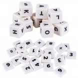 Colecția de cărămizi și dale afișează litere, numere și simboluri matematice. Cărămizile din plastic alb sunt proiectate pentru învățare și joacă.
