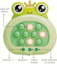 Jocul antistres electronic Broscuța POP IT este o alegere excelentă pentru distracție și dezvoltarea copiilor. Cu sunetele sale vesele și opțiunile interactive, această jucărie este populară atât printre copii, cât și printre adulți. Ajută la reducerea stresului, dezvoltarea minții, îndemânării manuale și coordonării ochi-mână. Datorită dimensiunii sale compacte, este ideal pentru distracție în timpul călătoriilor.