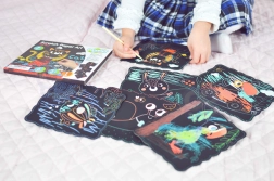 Șase cartonașe diferite cu pisică, câine, melc, iepuraș, peștișor și papagal îi motivează pe copii să creeze și să descopere culorile ascunse.