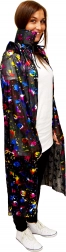 Pelerină stilată pentru micii magicieni și vrăjitoare, confecționată din material lucios cu imprimeu de dovleci colorați. Are un guler confortabil și legare cu șnur la gât pentru îmbrăcare ușoară. Lungimea de 120 cm este ideală pentru costumele de copii la carnaval, Halloween și petreceri tematice.