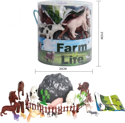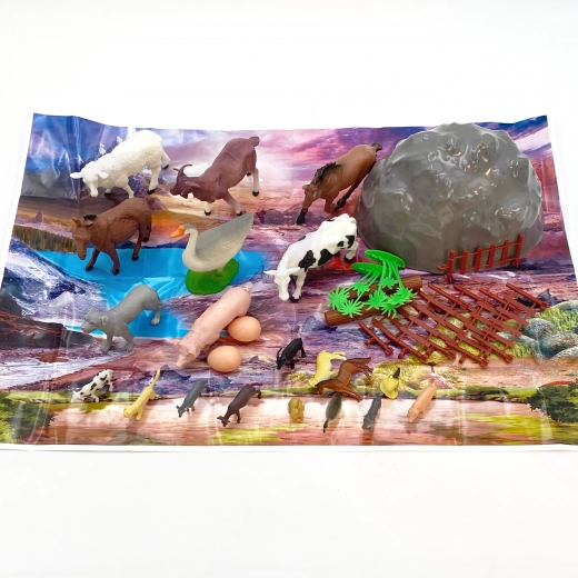 - figurine cu animale domestice, țarc, roci, plante, covoraș de joacă, hartă tematică, găleată/box de depozitare