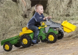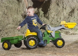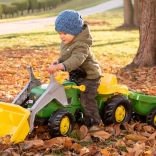 Tractorul cu pedale realist, în culorile iconice JOHN DEERE, dezvoltă imaginația, motricitatea și coordonarea copiilor. Datorită cupeii frontale funcționale, copiii se pot juca de-a fermierii, pot încărca frunze sau nisip și pot transporta mărunțișuri în remorca detașabilă. Capota rabatabilă ascunde o cutie practică pentru comori.