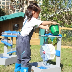 Construcția robustă din materiale rezistente cu finisaj netoxic este potrivită pentru utilizare în exterior. Copiii învață cu ușurință principiul cauză–efect: torn apă – roata se învârte. Stația cu apă este ideală pentru joaca lângă lada cu nisip, în grădină și în grădinițe.