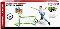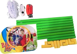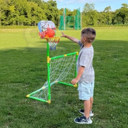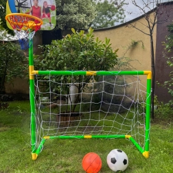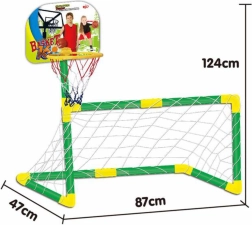 Conținutul pachetului: poartă de fotbal cu plasă, coș de baschet, minge de fotbal, minge de baschet, pompă mică.