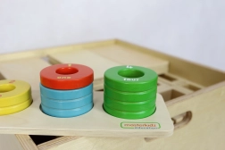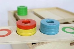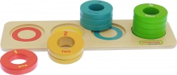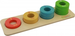Acest set educațional din lemn îmbină distracția cu învățarea. Copiii așază inelele colorate pe țăruși, le sortează după culoare și număr, exersând număratul de la unu la patru. Fiecare inel este marcat cu o cifră și cuvântul în limba engleză, ceea ce dezvoltă în mod natural percepția lingvistică.