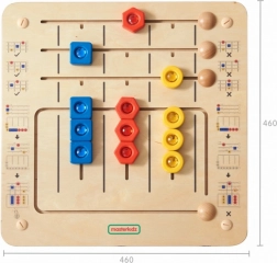Această tablă educațională este concepută pentru a sprijini recunoașterea formelor și motricitatea fină. Este împărțită în două părți: partea superioară conține o bandă de sarcini unde copiii trebuie să plaseze trei forme (hexagon roșu, pătrat albastru și cerc galben) în pozițiile corecte. Partea inferioară a tablei include trei coloane cu 9 forme pe care copiii trebuie să le potrivească corect după culoare și formă. Elementele sunt așezate astfel încât să poată fi mutate ușor, dar să nu se piardă. Tabloul poate fi folosit pe masă sau montat pe perete.
