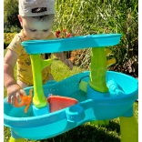 Copiii toarnă apă în partea de sus a mesei și urmăresc fluxul acesteia prin mori de apă și deschideri pentru un efect distractiv.