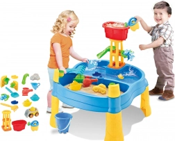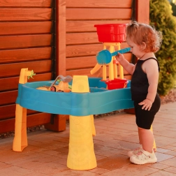 Căutați o măsuță versatilă pentru joaca celor mici în grădină, pe terasă sau în camera copilului? Această măsuță cu apă și nisip 2‑în‑1 oferă compartimente separate pentru apă și nisip, astfel încât copiii pot lua, turna și presăra ca pe plajă. Moara de apă pornește la turnare și susține înțelegerea relației dintre cauză și efect.