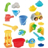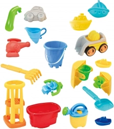 Forme, stropitoare, lopățică, greblă, mașinuță și două bărcuțe susțin construcția creativă, transferul de lichide și joaca în grup cu mai mulți copii.
