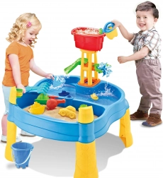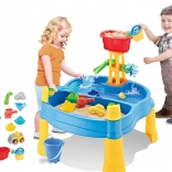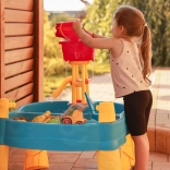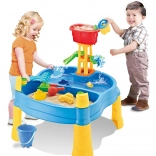 Dotarea bogată cu 14 accesorii (forme, stropitoare, moară, lopățică, greblă, mașinuță și 2 bărcuțe) dezvoltă imaginația, coordonarea mână–ochi și jocul împărtășit între mai mulți copii. Datorită construcției stabile din plastic, măsuța este potrivită pentru utilizare în exterior și interior și se curăță ușor.