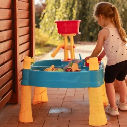 Două tăvițe separate permit umplerea uneia cu apă și a celeilalte cu nisip. Copiii pot alterna activitățile, pot amesteca materialele și pot descoperi diferite texturi fără dezordine.