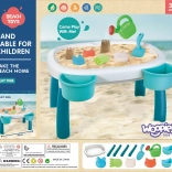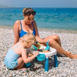 Pachetul include 7 accesorii practice – stropitoare, lopățică, 4 forme (caracatiță, pisică, panda, iepuraș) și două recipiente pentru măsuță. Datorită acestora, copiii pot crea construcții din nisip, pot turna apă și își pot dezvolta creativitatea și îndemânarea.