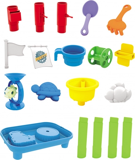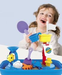 Include toate uneltele necesare pentru o joacă creativă cu nisip și apă - forme, greble, lopățele și altele.