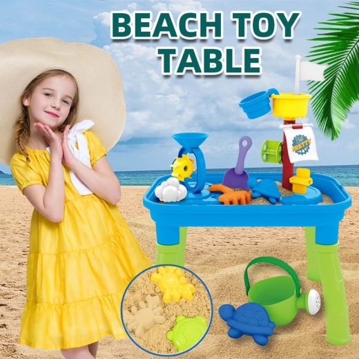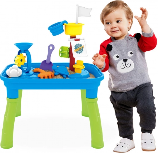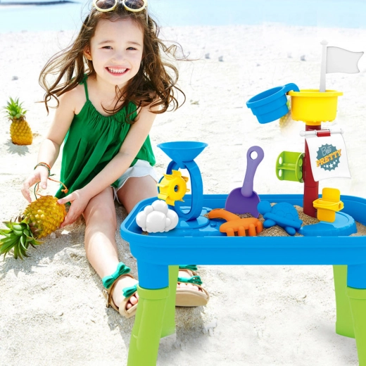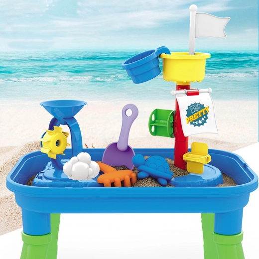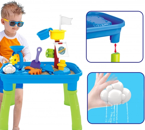 Combină masa de joacă cu apă și nisip într-un singur produs, permițând diverse opțiuni de joacă.