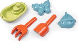 - Set bogat de accesorii - lopățică, greblă, bărcuță și două forme pentru nisip