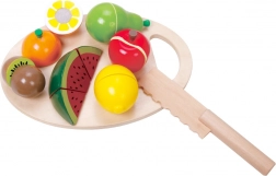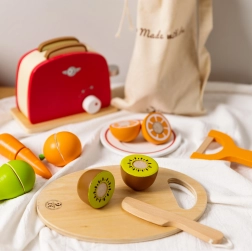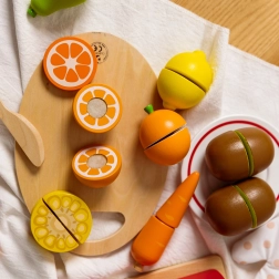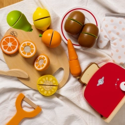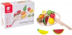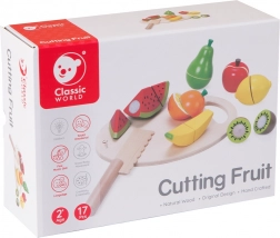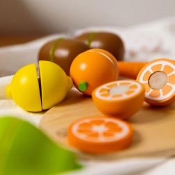 Setul de fructe de tăiat din lemn de la Classic World este o jucărie excelentă pentru micii bucătari. Conține 17 piese care îi învață pe copii să taie fructe pe o placă specială din lemn. Părțile individuale ale fructelor sunt unite cu scai, astfel încât copiii simt simțul real al tăierii. După tăiere, fructele pot fi ușor reasamblate și jocul poate începe din nou.
