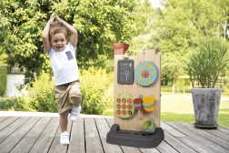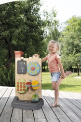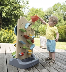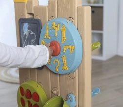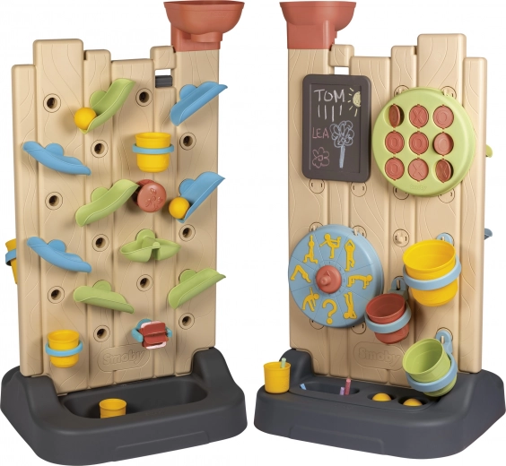 - Include 6 activități: jocuri cu apă, X și 0 (tic-tac-toe), tablă pentru cretă, roată sport, aruncare la țintă cu mingea și elemente interactive pentru crearea propriilor trasee de apă.