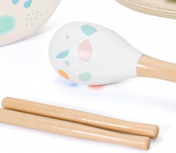 Setul conține cinci instrumente: țambal, maracas, tobă și două baghete - ideal pentru descoperirea muzicii.