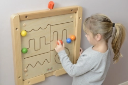 Tablă educativă din lemn de la Masterkidz cu diverse trasee curbate și butoane colorate ajută copiii să dezvolte motricitatea fină și orientarea spațială.