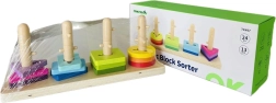 Acest sorter din lemn de calitate combină forme geometrice colorate și patru țăruși verticali pe o bază solidă. Copiii de la 2 ani își antrenează gândirea logică, răbdarea și prinderea corectă în timp ce așază piesele. Jucăria este realizată din lemn rezistent și este vopsită cu culori sigure, netoxice.