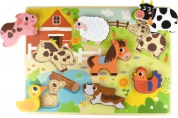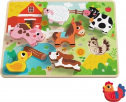 Piesele 3D cu animăluțe se potrivesc perfect în decupaje și îi învață pe copii să diferențieze formele și motivele de la fermă, dezvoltând în același timp coordonarea mână‑ochi.
