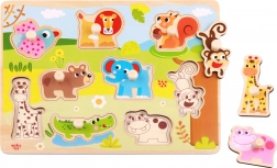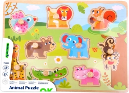 Puzzle-ul din lemn marca Tooky Toy este conceput pentru copii de la 18 luni și este ideal atât pentru acasă, cât și pentru grădiniță. Setul este format dintr-o planșă și 9 piese cu animale, care trebuie plasate în locurile corecte. În planșă se află adâncituri ce corespund formei pieselor colorate. Întregul set este realizat din lemn și vopsit cu culori sigure, care vor încânta orice copil și vor asigura multă distracție.