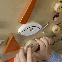 Tabla se utilizează ușor atât în ramă pe perete, cât și independent pe masă sau pe podea. Este robustă, sigură și ideală pentru abordarea Montessori a învățării prin activități senzoriale și practice.