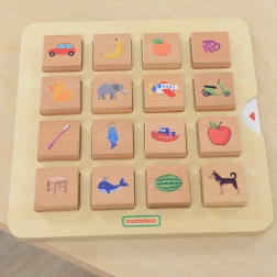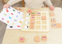 Acest joc educațional montessori combină o bază din lemn cu piese pătrate de introdus și cartonașe tematice. Copilul alege piesa corectă după imagine, silueta colorată sau umbra neagră și astfel își antrenează memoria vizuală, percepția formelor și culorilor și coordonația mână–ochi. Construcția solidă din lemn este plăcută la atingere și rezistentă pentru joaca de zi cu zi.