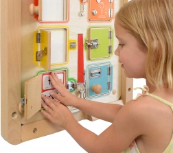 Această tablă robustă din lemn oferă 6 ușițe și mecanisme de închidere diferite – de la zăvoare simple la cârlige și belciuge mai complexe. Copiii își exersează prin joc răbdarea, îndemânarea degetelor și rezolvarea de probleme. Fiecare deschidere a ușiței aduce o recompensă sub forma unui spațiu pentru a ascunde mărunțișuri sau carduri.