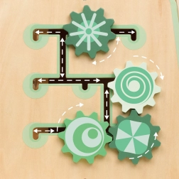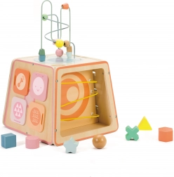 Labirintul cu mărgele, roțile dințate, glisoarele și sortatorul de forme mențin atenția copiilor și susțin concentrarea și gândirea logică.