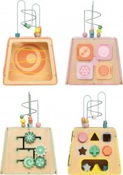 - 6 în 1 (ușițe misterioase, roți dințate, labirint cu mărgele, elemente glisante, sortator de forme, pistă pentru bilă)