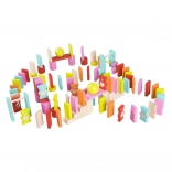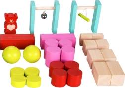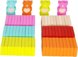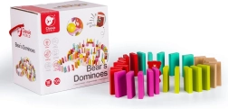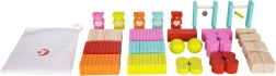 Acest set variat de domino din lemn aduce copiilor distracție pentru ore întregi. Veți găsi în el piese dreptunghiulare, figurine de urși, cilindri, cuburi, bile, porți cu clopoțel și cu bară transversală, precum și un săculeț textil. Combinația dintre lemnul natural și cele șase culori vii inspiră imaginația, construcția de trasee și secvențe multicolore.