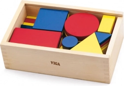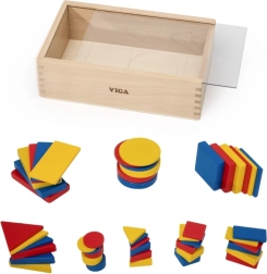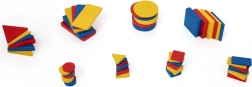 Set bogat de forme geometrice în roșu, galben și albastru, care îi motivează pe copii să compună modele, să sorteze și să recunoască formele și culorile.