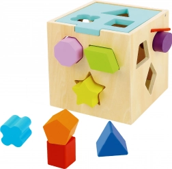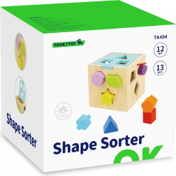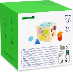 Cub de sortare din lemn Tooky Toy oferă ore de distracție pentru cei mici prin recunoașterea formelor. Acest casetă din lemn are șase laturi, dintre care patru conțin deschideri cu forme diferite pentru așezarea mai ușoară a 12 cuburi colorate. Întregul set este realizat robust și sigur pentru copii.